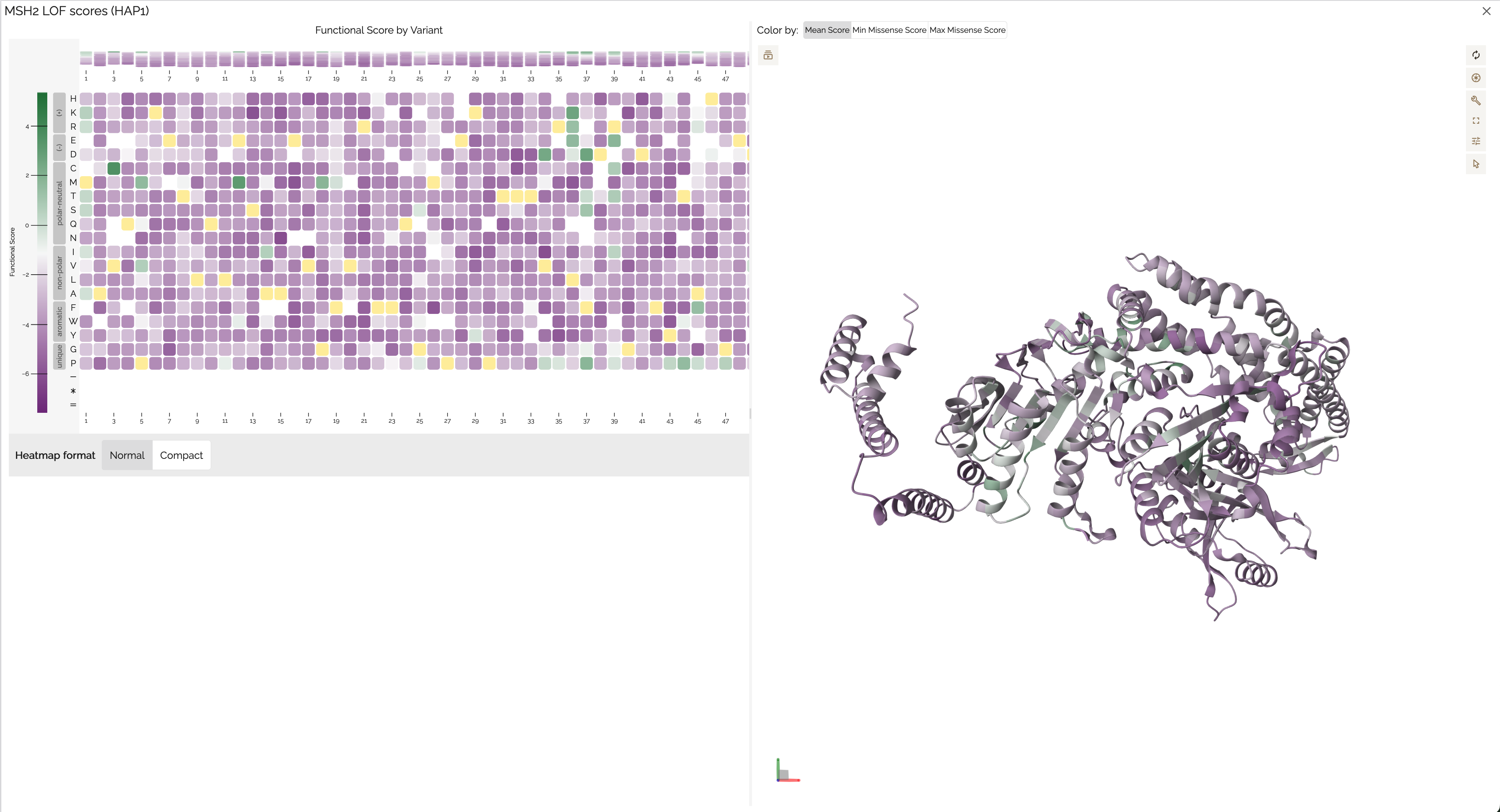 When a baseline score is available from a score calibration, the heatmap color scale centers the normal color (purple) at the baseline score to provide better visual contrast for variants that deviate from expected function.