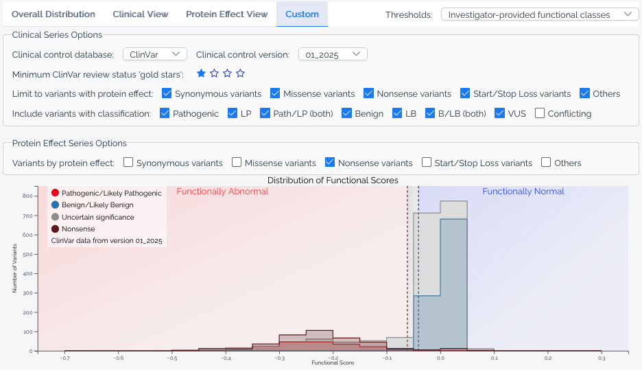 Available when a score set has been linked to ClinVar annotations. This view overlays the distribution of scores for variants classified as Pathogenic or Likely pathogenic and Benign or Likely benign in ClinVar, allowing users to assess how well the assay segregates known clinical variants. The ClinVar version used is always shown in the histogram legend.