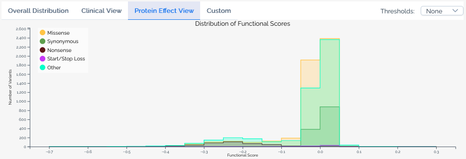 Available when a score set includes variant effect predictions. This view overlays the distribution of scores for variants predicted to have different effects on the protein, such as missense, nonsense, and synonymous variants.